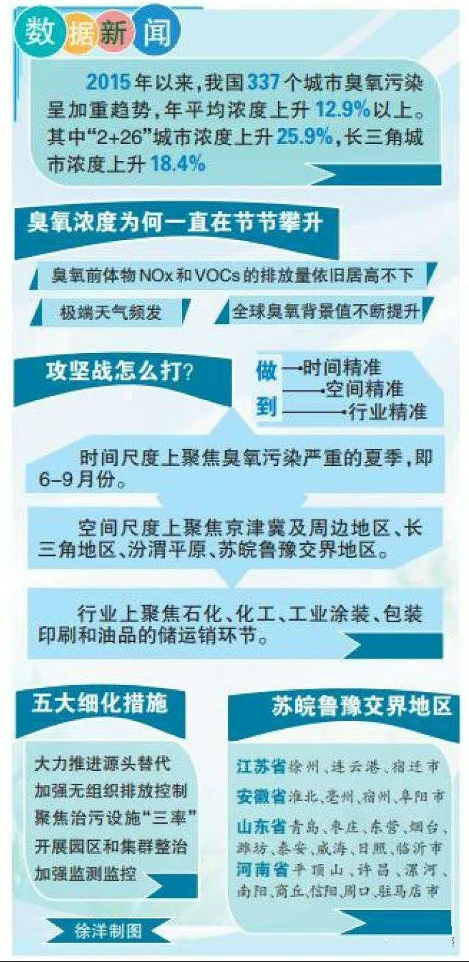 这一变化体现了统筹PM2.5和臭氧协同防治的大趋势,升级版的蓝天保卫战行动计划正在制定中。目前臭氧污染形势如何?苏皖鲁豫交界地区为何被划分为重点区域?夏季臭氧攻坚战如何开展?这些问题成为当下人们关注的焦点。